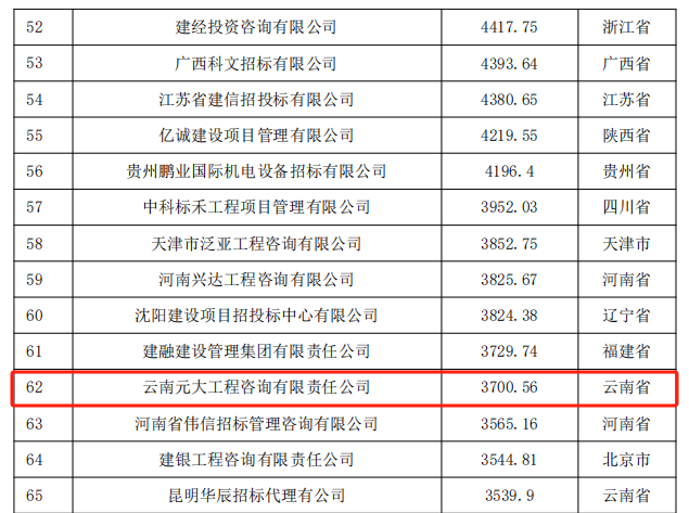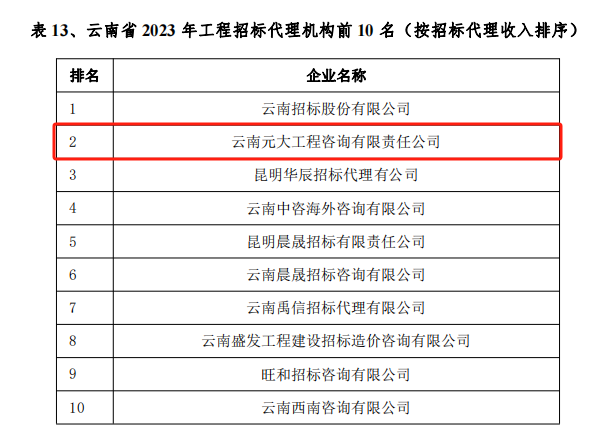 喜讯 !2023年工程招标代理行业发展报告已出,2023年工程招标代理机构公司排名第62名,2023年云南省工程招标代理机构公司排名第2名。