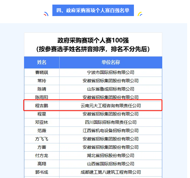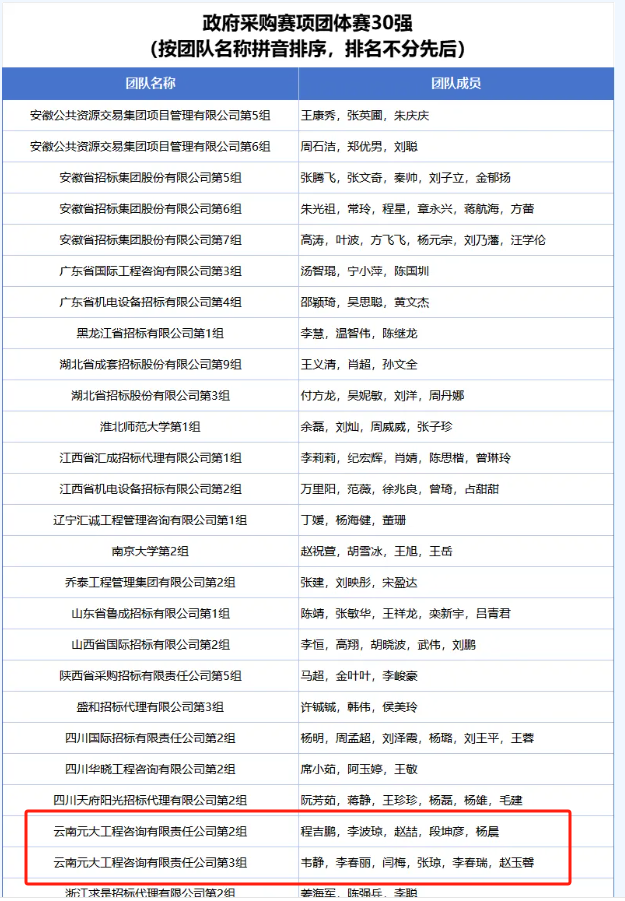 在团体赛中,云元咨询成功获评政府采购团体赛30强(第2组 程吉鹏、李波琼、赵喆、段坤彦、杨晨;第3组 韦静、李春丽、闫梅、张琼、李春瑞、赵玉馨)。在个人赛中,韦静、程吉鹏、李波琼、张琼成功跻身全国100强。